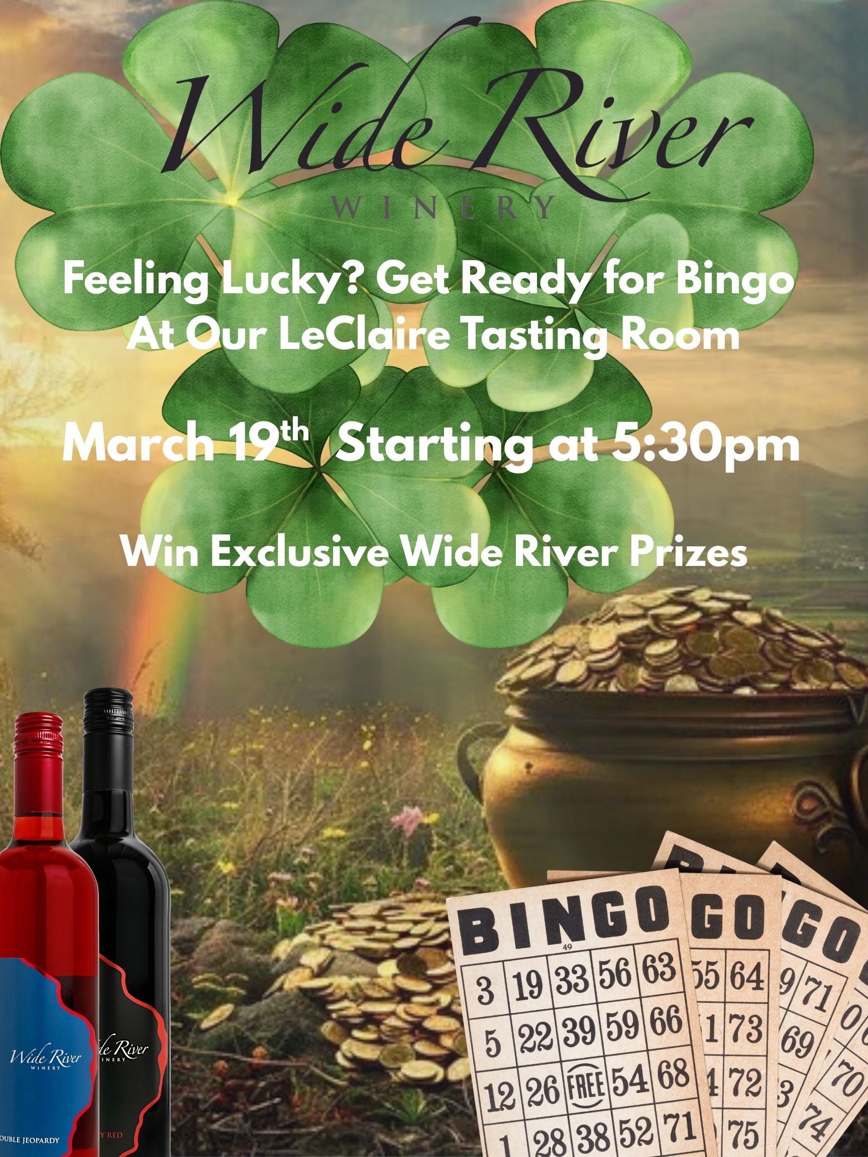 Get ready for bingo night at our LeClaire tasting room on Thursday, March 19th starting at 5:30pm. Bring your luckiest group of bingo champions and compete for exclusive Wide River Winery prizes that can be redeemed at any of our tasting rooms. Bingo is free to play and our full wine and food menu will be available throughout the game!